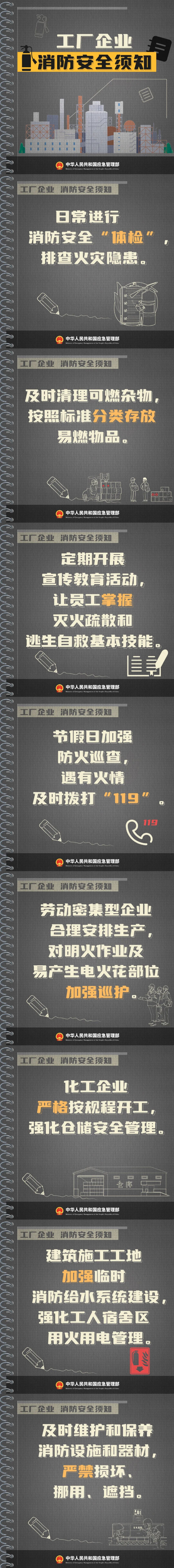 大火无情 为了避免事故的发生 火灾预防工作必须要做好 而当火灾真的来临时 同样也要学会面对 下面这些防火安全提示 请查收 ↓ ↓ ↓ 对于工厂企业 冬季天气寒冷 用火用电增加 易导致火灾发生 要杜绝带病作业 及时排查消除安全隐患 保障生产安全 这份消防安全提示请收好! ↓ ↓ ↓