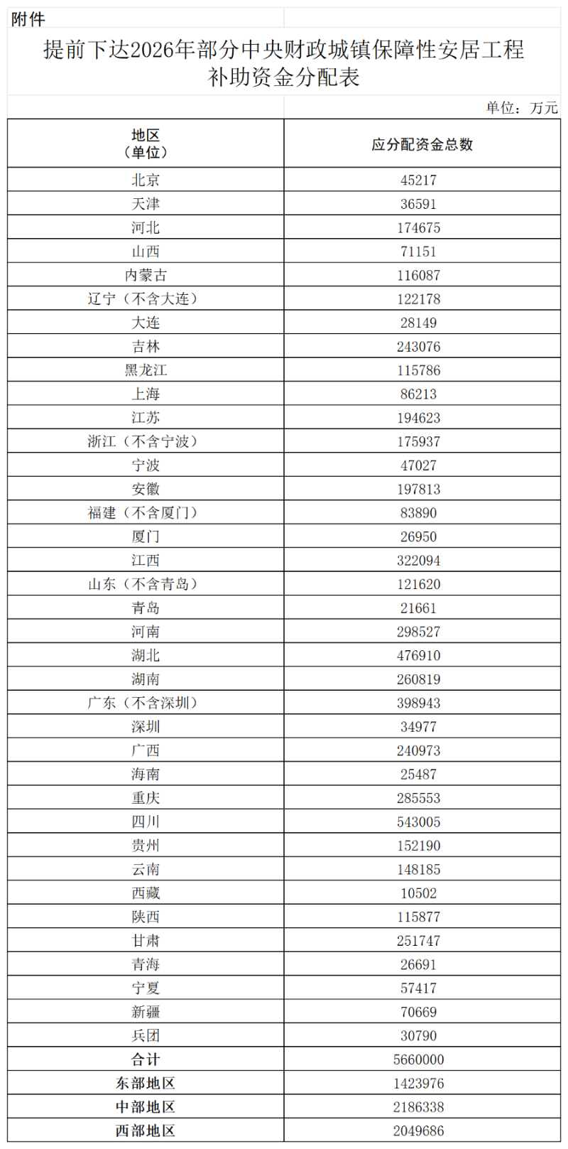 近日,财政部发布关于提前下达2026年部分中央财政城镇保障性安居工程补助资金预算的通知。