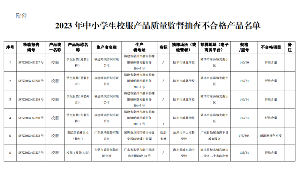附件:2023年中小学生校服产品质量监督抽查不合格产品名单