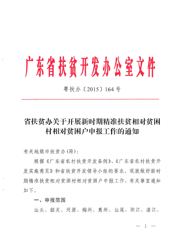 省扶贫办关于开展新时期精准扶贫相对贫困村相对贫困户申报工作的通知(粤扶办[2015]164号)