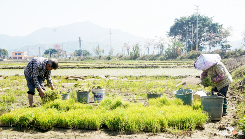 农户在育秧田移栽秧苗,保障水稻种植顺利开展。