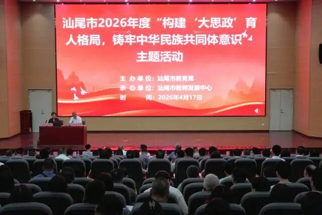 17日下午,汕尾市2026年度“构建‘大思政’育人格局,铸牢中华民族共同体意识”主题活动在汕尾市教师发展中心举行,市教育局负责同志,市教师发展中心主要负责同志,全市教育系统校长、思政骨干教师约450人参加。