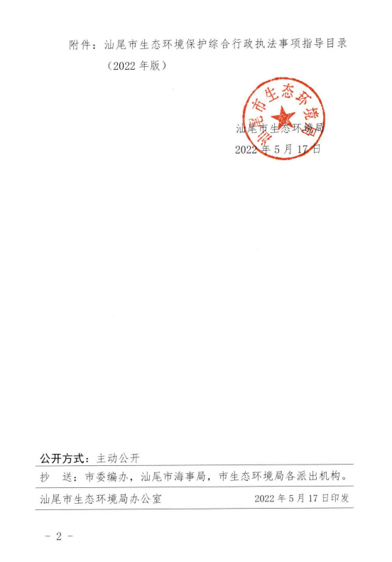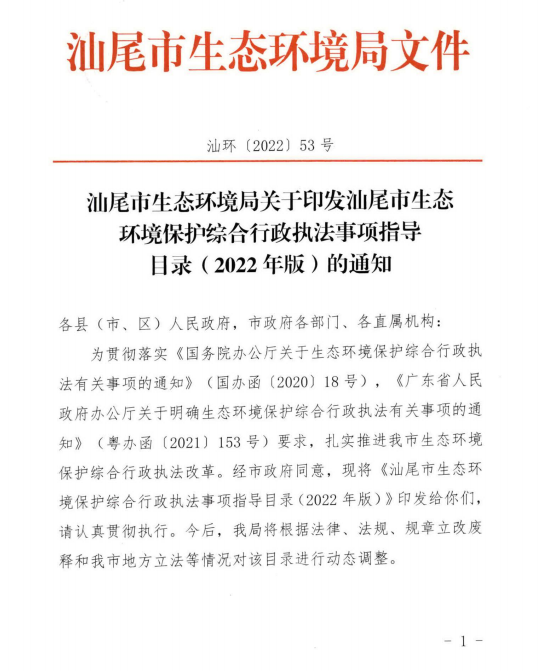 汕尾市生态环境局关于印发汕尾市生态环境保护综合执法事项指导目录的通知