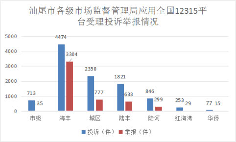 2023年,汕尾市各级市场监督管理局统一应用全国12315平台受理从12345市民服务热线、信件、来函等投诉举报渠道接收的各类投诉举报共计15626件,同比增长42.18%,其中投诉10534件,同比增长57.03%;举报5092件,同比增长18.91%。为消费者挽回经济损失556万元,罚没金额57.28万元。