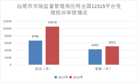 2023年,汕尾市各级市场监督管理局统一应用全国12315平台受理从12345市民服务热线、信件、来函等投诉举报渠道接收的各类投诉举报共计15626件,同比增长42.18%,其中投诉10534件,同比增长57.03%;举报5092件,同比增长18.91%。为消费者挽回经济损失556万元,罚没金额57.28万元。