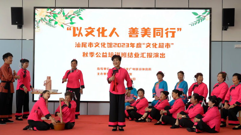 汕尾市文化馆2023年度“文化超市”秋季公益培训在市文广旅体局的指导下,深入基层、走进学校,以“文化超市”的形式,让群众根据自身喜好,报名参加内容丰富、形式多样的免费培训。本期秋季培训班开设声乐、舞蹈、朗诵、渔歌及传统戏曲等16门课程,设置448个课时,参与培训学员达11000多人次,惠及老中青各年龄阶层。