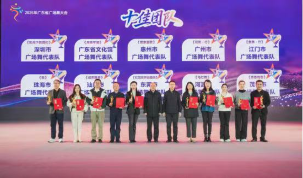 11月20日,由广东省文化和旅游厅主办的2025年广东省广场舞大会在惠州举办,此次大会分为集中展演和优秀作品展演两个环节,来自全省各地市及省文化馆的23支广场舞队伍齐聚一堂,以舞会友,同台竞秀,展示了极具岭南地域特色的创新广场舞编创成果。其中,我市选送的《咸茶飘香》凭借精湛的编排和出色的现场表现,荣获“十佳团队”称号。