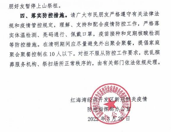 红海湾经济开发区新冠肺炎疫情防控指挥部办公室关于2022年清明期间暂停祭扫活动的通告