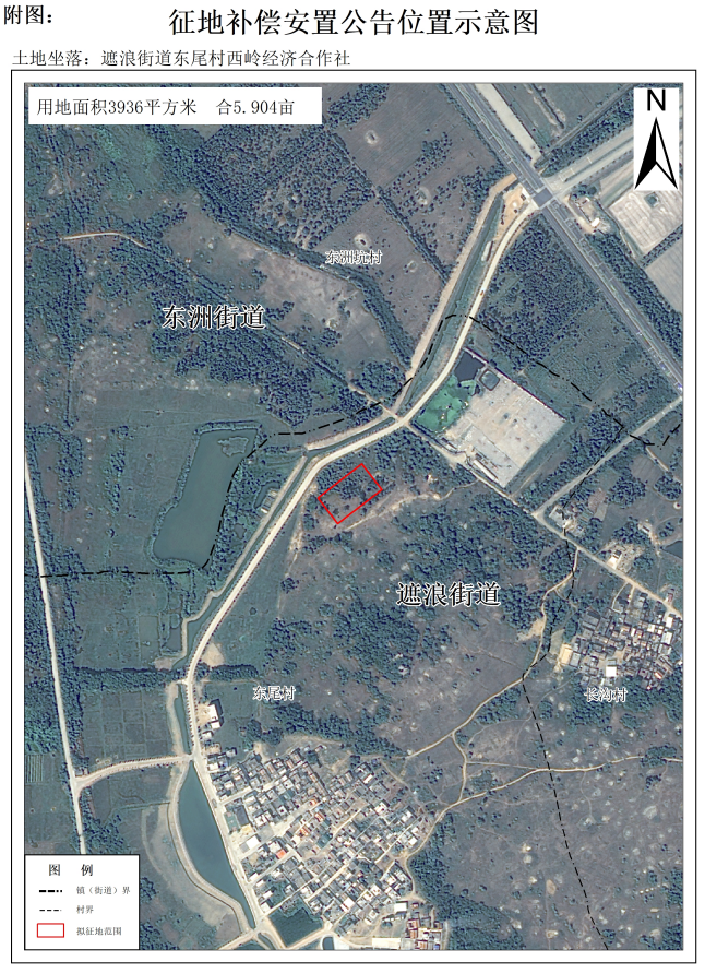 一、拟征收土地位置:遮浪街道东尾村西岭经济合作社,面积0.3936公顷(征地四至范围详见征地红线图)。