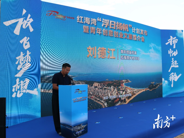 汕尾市浮日湾旅游景区管理有限公司刘德江作为青年创业代表上台发言,刘德江表示,作为青年一代有责任、有义务为家乡的文旅事业贡献自己的青春与智慧,同时将以更加饱满的热情、更加务实的作风,投身到家乡的建设中去,绽放出更加璀璨的光芒。