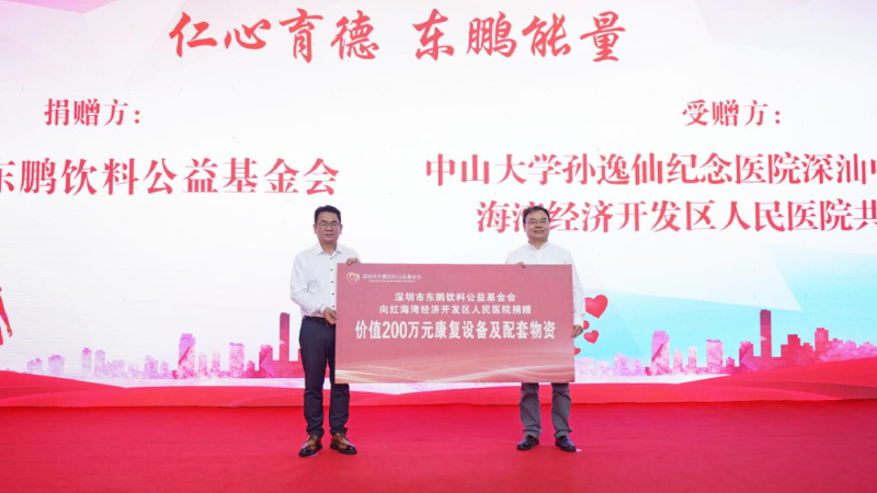 仪式上,东鹏饮料集团向红海湾经济开发区捐赠了200万元的助学助教资金以及价值200万元的康复医疗设备及配套物资。