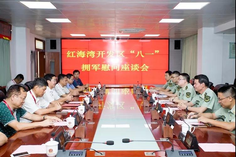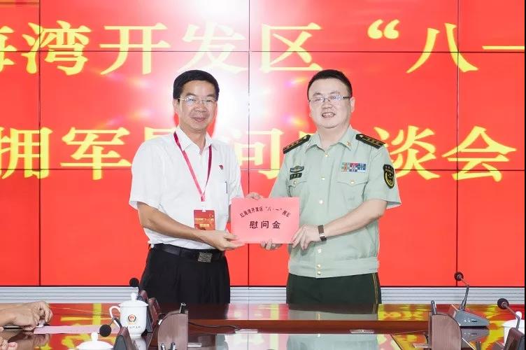 吴城鑫一行与部队官兵进行座谈,向各部队官兵介绍今年来红海湾经济社会发展情况,并代表红海湾开发区党工委、管委会和全区人民群众感谢部队为当地经济建设、社会治安等方面一直以来做出的贡献,向部队官兵赠送慰问金和慰问信,并提前向他们送去建军节的祝福。驻市各部队官兵感谢区党工委、管委会对他们的支持和关怀,并表示他们一定会继续发扬保家卫国的优良传统,继续为社会和谐稳定贡献力量。