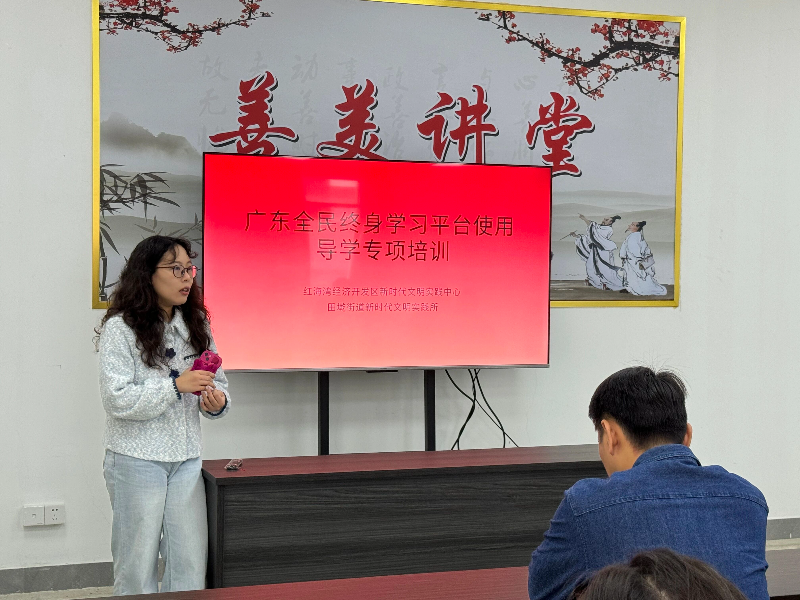 培训现场,主持人通过图文结合的方式,详细介绍了平台的建设背景、资源优势、核心功能等内容。重点讲解了平台在思政育人、技能提质、文化艺术、乐龄学习方面的特色资源,展示了平台在针对学生、老年人等不同群体上的精准适配学习课程优势,让在场的参训人员对“广东全民终身学习平台”有了深刻的了解和认识。
