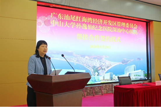 中山大学孙逸仙纪念医院党委书记古小红在仪式上讲话,她表示,本次签约建立紧密型医联体,开启了中山大学孙逸仙纪念医院、深汕中心医院和汕尾市深化合作、携手发展崭新篇章,对完善汕尾市医疗卫生体系,提高医疗服务质量,加快医疗卫生事业高质量发展具有十分重要的促进作用。中山大学孙逸仙纪念医院将以此为契机,充分发挥人才、技术和资源优势,发挥国家区域医疗中心辐射能力,在医疗技术、人才培养、学科建设等方面加强指导交流,实现资源共享、优势互补、共同发展,打造成为粤东地区乃至全省、全国医疗高地,让更多的常见病、多发病能够在基层内得到解决,为提升人民群众看病就医的获得感、幸福感、安全感作出新的更大贡献。