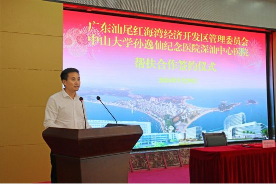 红海湾经济开发区党工委书记、管委会主任郭立坚在签约仪式上致辞,他表示,合作协议的签订标志着帮扶合作进入新阶段,这是一项惠民生、利长远、促发展的民心工程,将有效推动优质医疗资源扩容下沉,让红海湾人民在家门口就能享受到“中山医”的医疗服务。红海湾将举全区之力、竭尽所能地为帮扶合作创造最佳环境、提供最优服务、做实最好保障,确保成效明显、惠民有感。同时也期望以本次合作帮扶为契机,依托深汕中心医院的资源优势,聚焦管理、技术、人才、救治等重点领域,以“输血”和“造血”相结合,在补齐医疗服务短板、强化人才培养、提升诊治水平等方面进行深度帮扶,推动国家区域医疗中心资源在红海湾落地生根、开花结果,创造地方和医院双向赋能、共同发展的良好局面。