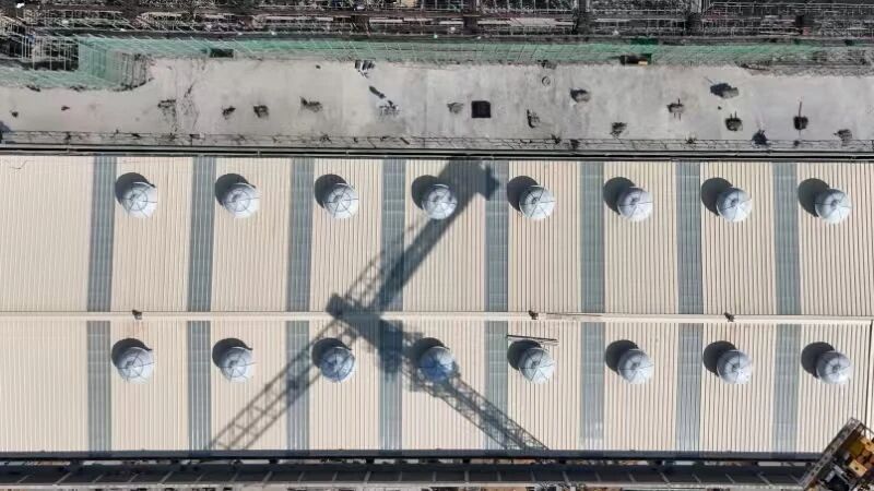 本次完成屋面断水的6号主厂房屋面纵向跨度102米,横向33米,高37.125米,整体结构跨度大、施工难度高。屋面采用“底板+防水保温隔层+面板”复合桁架结构,坚固耐用且保温性能优良。为高质量完成节点目标,公司制定了周密的安全管控措施,优化施工方案,合理调配资源,科学组织作业,严格把控施工质量,确保屋面系统安装各项指标均符合设计规范,顺利完成6号主厂房屋面断水任务,为后续设备安装等工作奠定了良好基础。