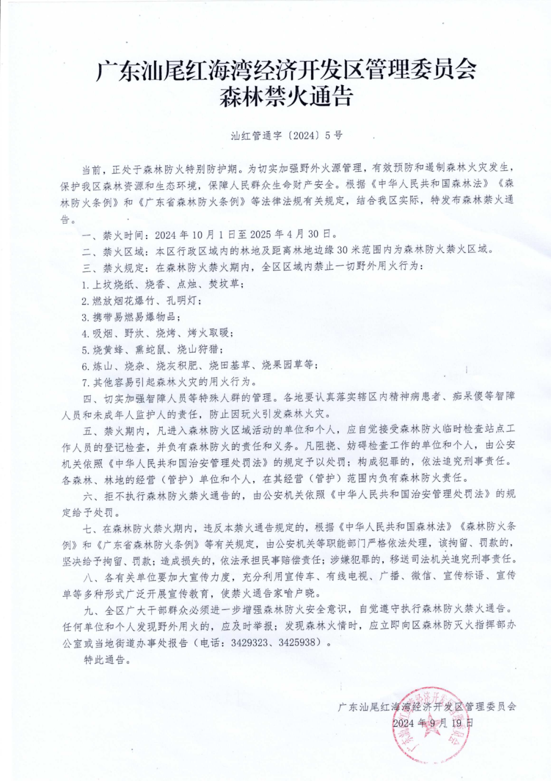 广东汕尾红海湾经济开发区管理委员会森林禁火通告