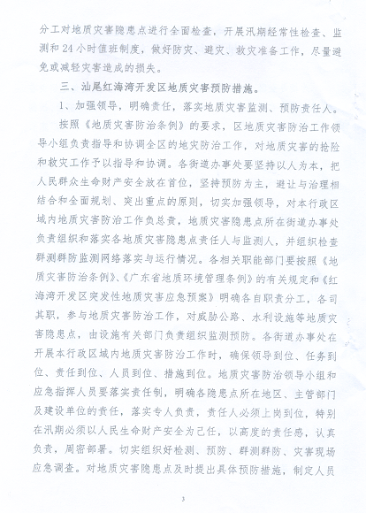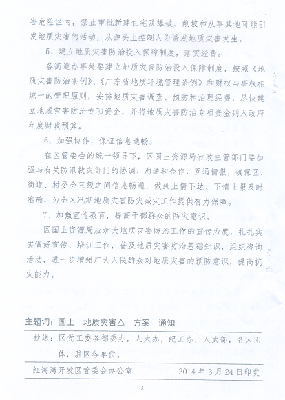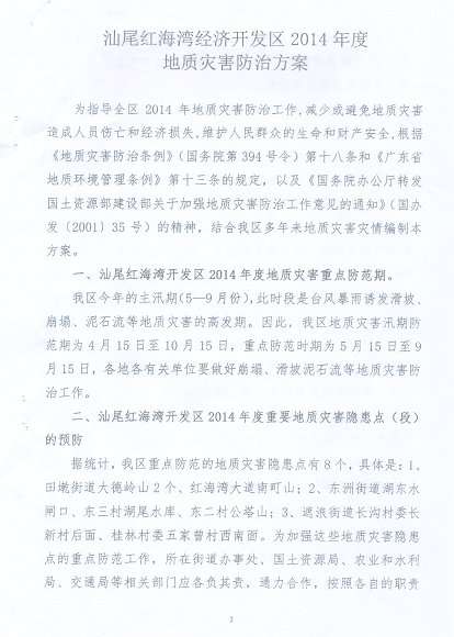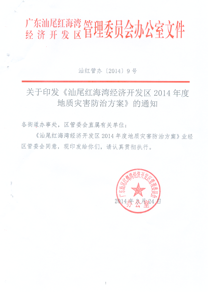 关于印发《红海湾经济开发区2014年度地质灾害防治方案》的通知
