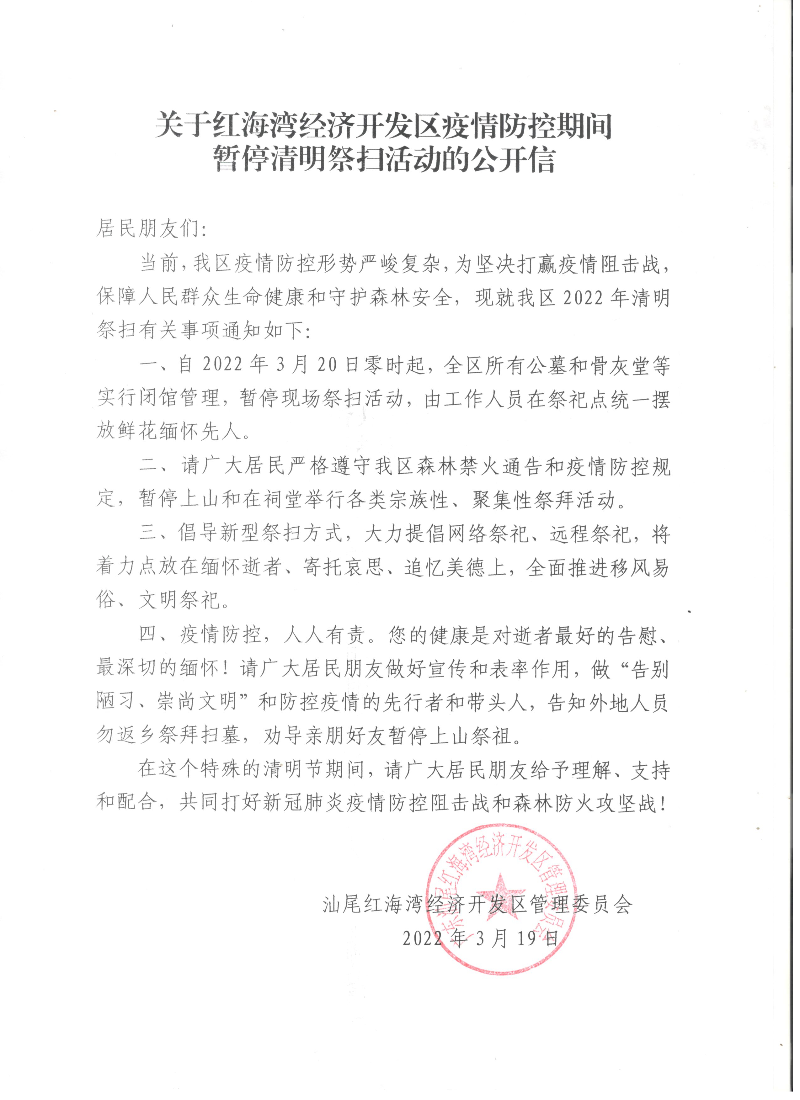 当前,我区疫情防控形势严峻复杂,为坚决打赢疫情阻击战,保障人民群众生命健康和守护森林安全,现就我区2022年清明祭扫有关事项通知如下: