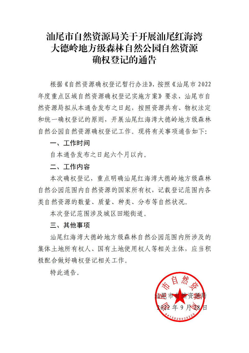 汕尾市自然资源局关于开展汕尾红海湾大德岭地方级森林自然公园自然资源确权登记的通告