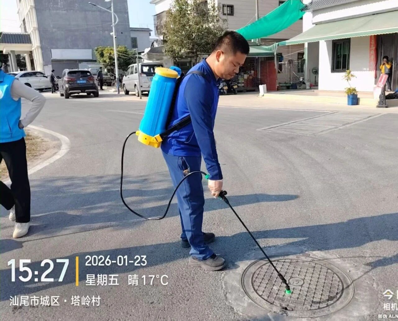 以大力开展环境整治,优化人居环境为目标,红海湾组织广大干部职工、志愿者及群众,对各类积水容器、闲置杂物、卫生死角进行集中清理。行动共清理各类孳生地200 余处,从源头切断蚊虫繁殖链条。同时组织灭蚊专业消杀队伍对下水道、绿化带、垃圾中转站等蚊虫易聚集区域,开展精准药物喷洒。对居民家中的地漏、花盆托盘等小型积水点进行入户消杀指导。宣传引导入心,通过“线上 + 线下”结合的方式,利用公众号、村村通广播、入户发放告知书等渠道,广泛普及防蚊灭蚊知识。累计覆盖群众超 1.2 万人次,营造“全民参与、人人动手”的浓厚氛围。